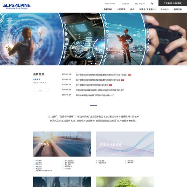 以“組件”、“傳感器與通信”、“模塊與系統(tǒng)”這三項事業(yè)為核心、阿爾卑斯阿爾派通過電子與通信這兩個領(lǐng)域不斷為人們的生活提供支持,朝著可持續(xù)發(fā)展的“價值創(chuàng)造型企業(yè)集團(tuán)”這一目標(biāo)不斷前進(jìn)。