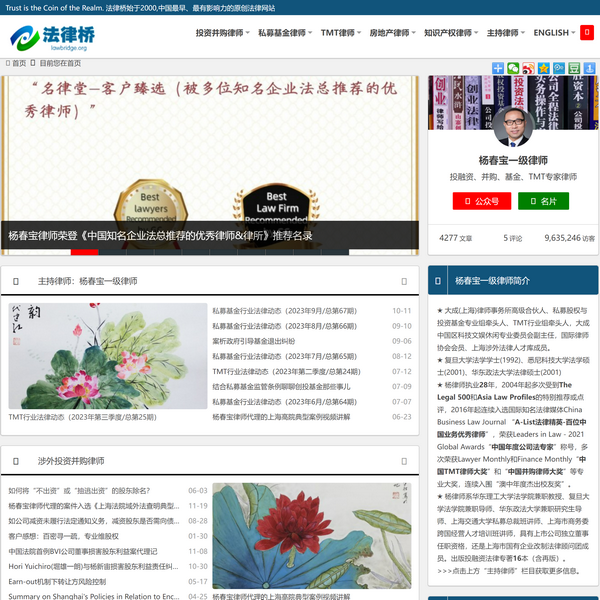 上海一級涉外律師楊春寶主持的專業(yè)法律咨詢網(wǎng)站,提供公司設(shè)立、并購重組、私募基金、外資并購、知識產(chǎn)權(quán)、房地產(chǎn)開發(fā)、TMT及電子商務(wù)等領(lǐng)域法律法規(guī)、法律論文、法律動態(tài)、法律咨詢、案例判例和法律顧問等律師服務(wù)。