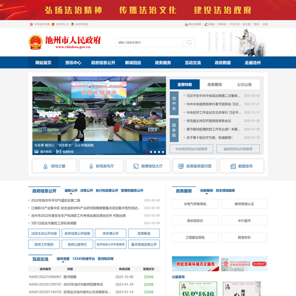 池州市人民政府網(wǎng)站是在池州市委、市政府領(lǐng)導(dǎo)親自關(guān)心、指導(dǎo)下建立和發(fā)展起來的政府門戶網(wǎng)站,始終堅(jiān)持以努力建設(shè)“服務(wù)政府、責(zé)任政府、法治政府”為目標(biāo),以“為民、便民、利民”為宗旨,以發(fā)布政府信息、拓展網(wǎng)上辦事、提供便民服務(wù)和開展互動(dòng)交流為主要內(nèi)容。