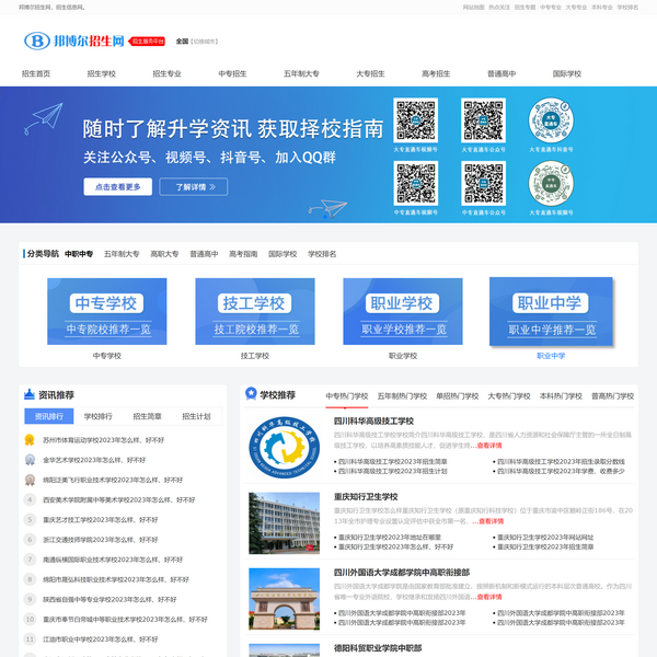 招生網提供中專、大專、本科、高中學校、國際學校、五年制大專、單招等招生考試信息。