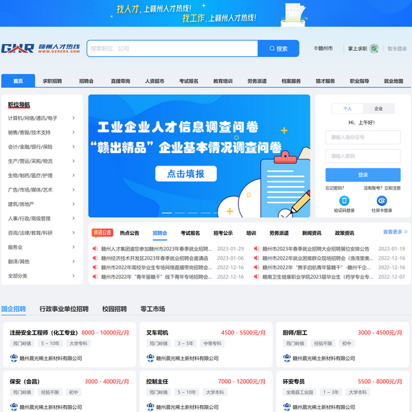 贛州人才熱線是贛州市人力資源和社會(huì)保障局官方招聘網(wǎng)站,由贛州市人力資源有限公司運(yùn)營(yíng)管理,招聘服務(wù)熱線:0797-5550199