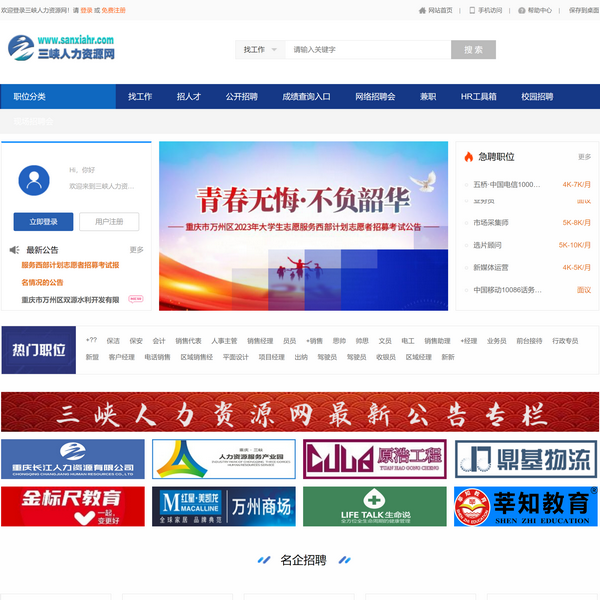 三峽人力資源網(wǎng)專門打造三峽地區(qū)人才資源寶庫,集培訓與就業(yè)人才輸送于一體!