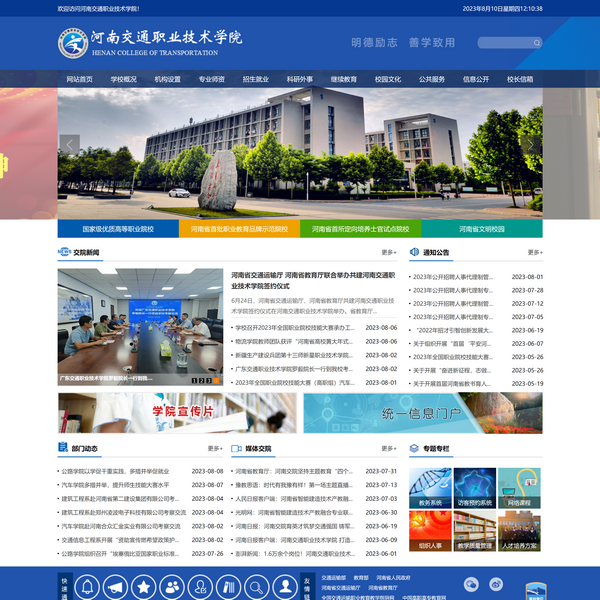 河南交通職業(yè)技術(shù)學院位于華夏文明的重要發(fā)祥地、國家歷史文化名城、中國八大古都、全國重要的綜合交通樞紐、國家中心城市鄭州。學校創(chuàng)辦于1953年,是一所交通運輸特色鮮明的工科院校。學校歷經(jīng)河南省交通廳干部培訓班、河南省交通運輸干部學校、鄭州交通??茖W校、河南省交通學校等歷史沿革。2004年,經(jīng)河南省人民政府批準升格為高職院校;2014年,被命名為“河南省文明單位”;2015年,被省教育廳確定為“河南省職業(yè)教育品牌示范院校”,同年在全省率先開展定向培養(yǎng)直招士官工作;2018年,成為河南省博士后創(chuàng)新實踐基地;2019年,被教育部確定為“***優(yōu)質(zhì)高等職業(yè)院?!?,成為全國200所、全省9所獲批院校之一;2020年,獲評“河南省文明校園”,被省教育廳、財政廳、發(fā)改委確定為河南省“高職雙高工程”建設(shè)單位;被國家郵政局授予“全國郵政行業(yè)人才培養(yǎng)基地”;2021年,被教育部認定為首批全國急救教育試點學校;2022年,被《中國職業(yè)教育質(zhì)量年度報告》評選為全國100所高職院校學生發(fā)展指數(shù)優(yōu)秀院校。