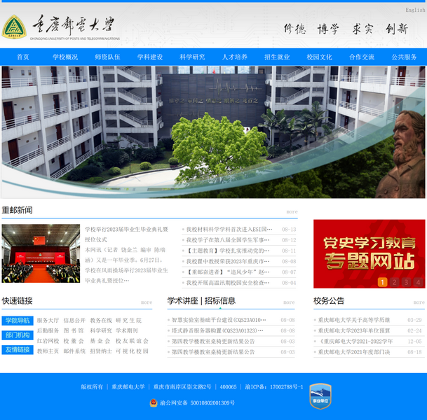 重慶郵電大學(xué)創(chuàng)辦于1950年,是工業(yè)和信息化部與重慶市共建的一所教學(xué)研究型大學(xué),也集軍事、民用相結(jié)合,以信息科學(xué)技術(shù)為特色的省部共建重點(diǎn)高校,被譽(yù)為“中國信息通信人才的搖籃。