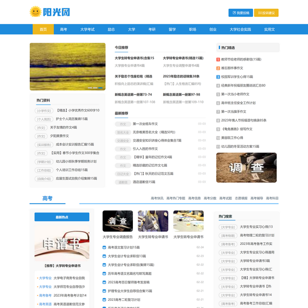 陽光大學生網(wǎng),關(guān)注大學生成長,提供大學生課后答案、勵志美文、期末試題、社會實踐報告、大學生新聞、論文、簡歷、英語四六級等免費下載、學習指南權(quán)威咨訊,推薦健康向上的文章,讓你每一天的生活充滿陽光。