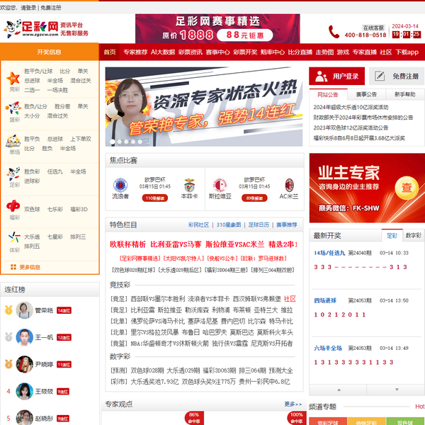 足彩網(wǎng),始創(chuàng)于2001年,是中國專業(yè)足球彩票信息服務(wù)平臺。提供競彩、足球彩票、競彩足球、體育彩票、福利彩票等多種彩票資訊及預(yù)測服務(wù),并有實時足球(足彩)比分直播、競彩比分直播和彩票八方預(yù)測數(shù)據(jù)分析,囊括宮磊等上萬名專業(yè)分析師。