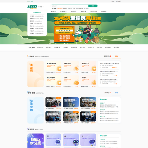 新東方官網(wǎng)為您提供新東方留學(xué)考試(雅思、托福、GRE、GMAT等)、大學(xué)考試(考研、四六級(jí)、專(zhuān)升本等)、青少年素質(zhì)教育(少兒編程、機(jī)器人、少兒美術(shù)、少兒科學(xué))、英語(yǔ)日語(yǔ)等語(yǔ)言類(lèi)教育培訓(xùn)、職業(yè)教育培訓(xùn)課程報(bào)名入口、報(bào)名咨詢(xún)電話(huà)、校區(qū)信息。同時(shí)提供智能學(xué)習(xí)服務(wù)、留學(xué)申請(qǐng)規(guī)劃、國(guó)內(nèi)國(guó)外游學(xué)研學(xué)及旅游服務(wù)。歡迎您到校參觀咨詢(xún)。