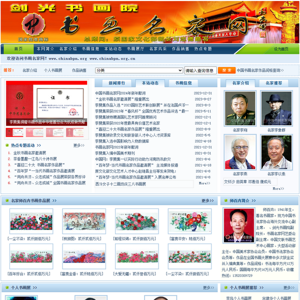 書畫名家網(wǎng)由劍光書畫院主辦,它是全國專業(yè)性、權威性的國際互聯(lián)網(wǎng)站。書畫名家網(wǎng)宗旨是弘揚中國書畫印藝術,使中國傳統(tǒng)文化藝術走向世界,同時使中國書畫印藝術家面向世界,并大力擴展中國書畫印藝術市場,為推進海內外書畫藝術交流及發(fā)展做出貢獻。