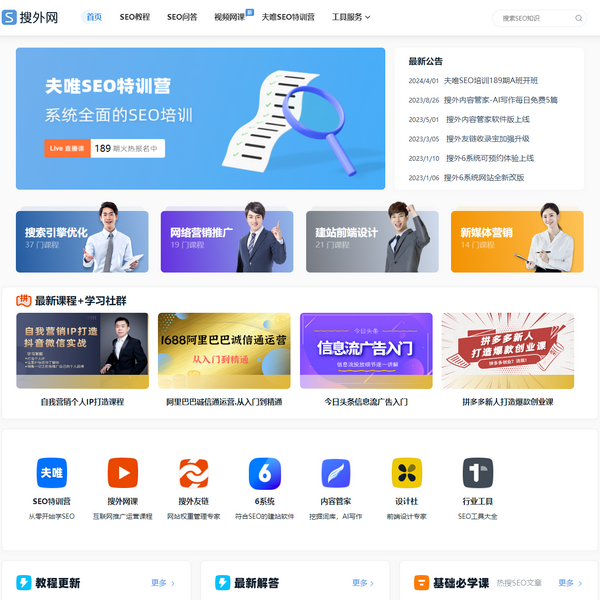 搜外網專注SEO培訓以及網絡營銷技術視頻網課。為廣大站長提供SEO系統(tǒng)技術知識學習,掌握搜索引擎排名流量的獲取技術。新增Google獨立站SEO,另提供符合SEO優(yōu)化的6系統(tǒng)、友鏈交換的搜外友鏈。