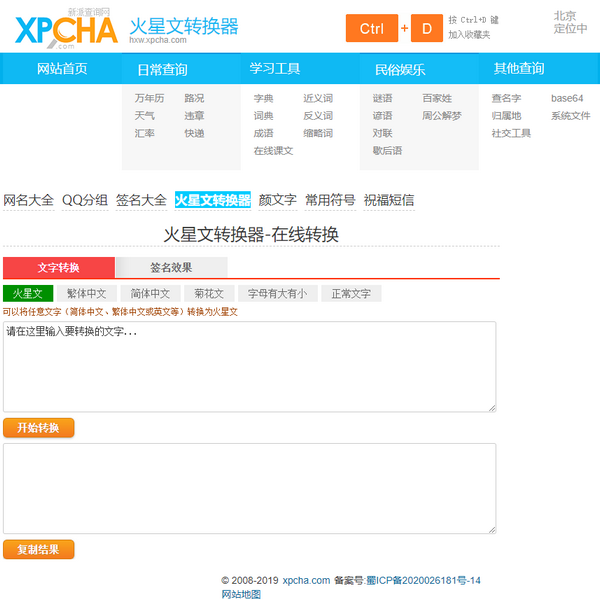 火星文轉(zhuǎn)換器是一款強大的在線文字轉(zhuǎn)換工具,提供火星文、非主流繁體字、線體字、簽名效果、菊花文轉(zhuǎn)換,藝術字體在線生成器等功能。并且提供了各種類型的表情符號,是制作QQ網(wǎng)名、個性簽名的實用工具。